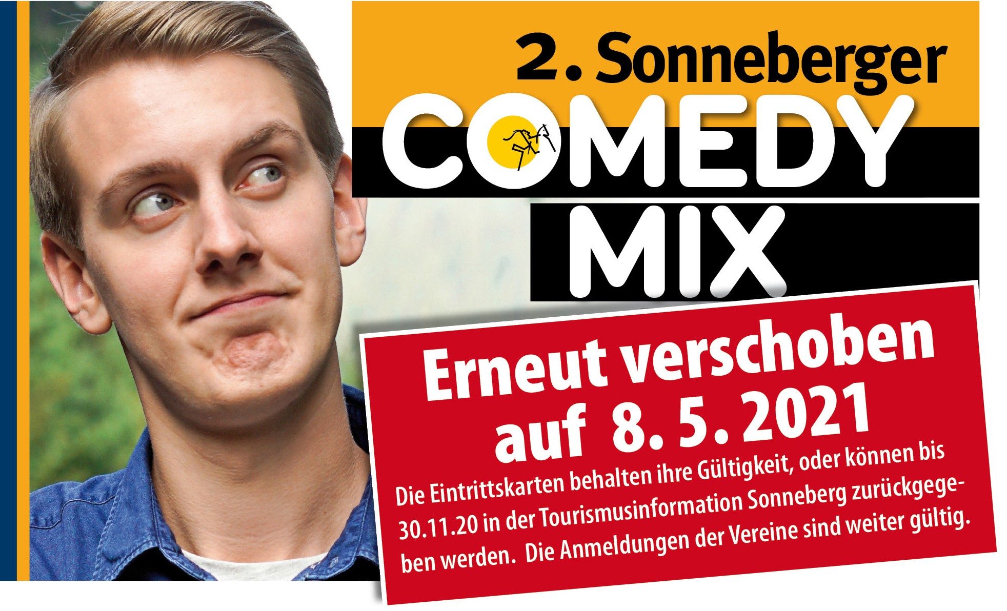 Nun stehen die Initiatoren erneut vor dem Problem, - keine Großveranstaltungen während der Pandemie. Deshalb muss der 2. Comedy Mix erneut verschoben werden. Der neue Termin ist der 08.05.2021 und alle drei Comedians haben bereits zugesagt.