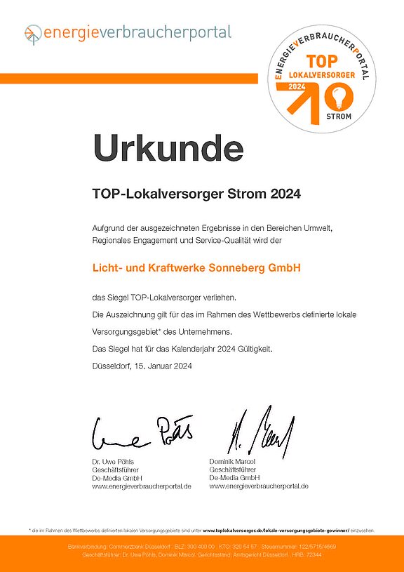 Durch uns werden Sie ausgezeichnet versorgt.Um die begehrte Auszeichnung TOP-Lokalversorger vom unabhängigen Energieverbraucherportal verliehen zu bekommen, haben wir uns strengen Prüfkriterien gestellt. Mit unseren hervorragenden Serviceleistungen, fairen Preisen und Tarifen und nicht zuletzt auch durch unser regionales Engagement konnten wir uns die Auszeichnung „TOP-Lokalversorger 2025“ sichern.