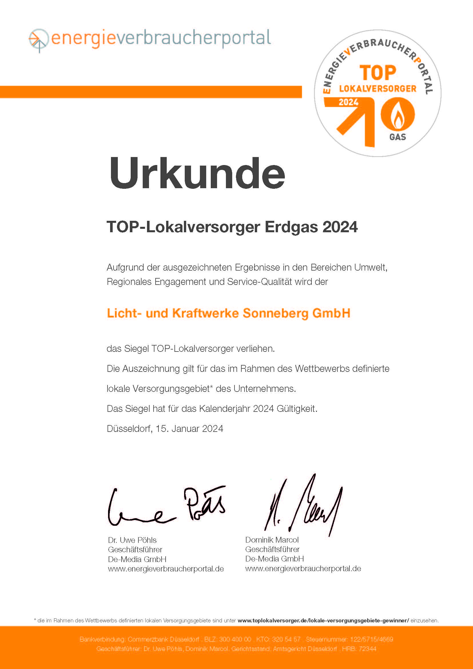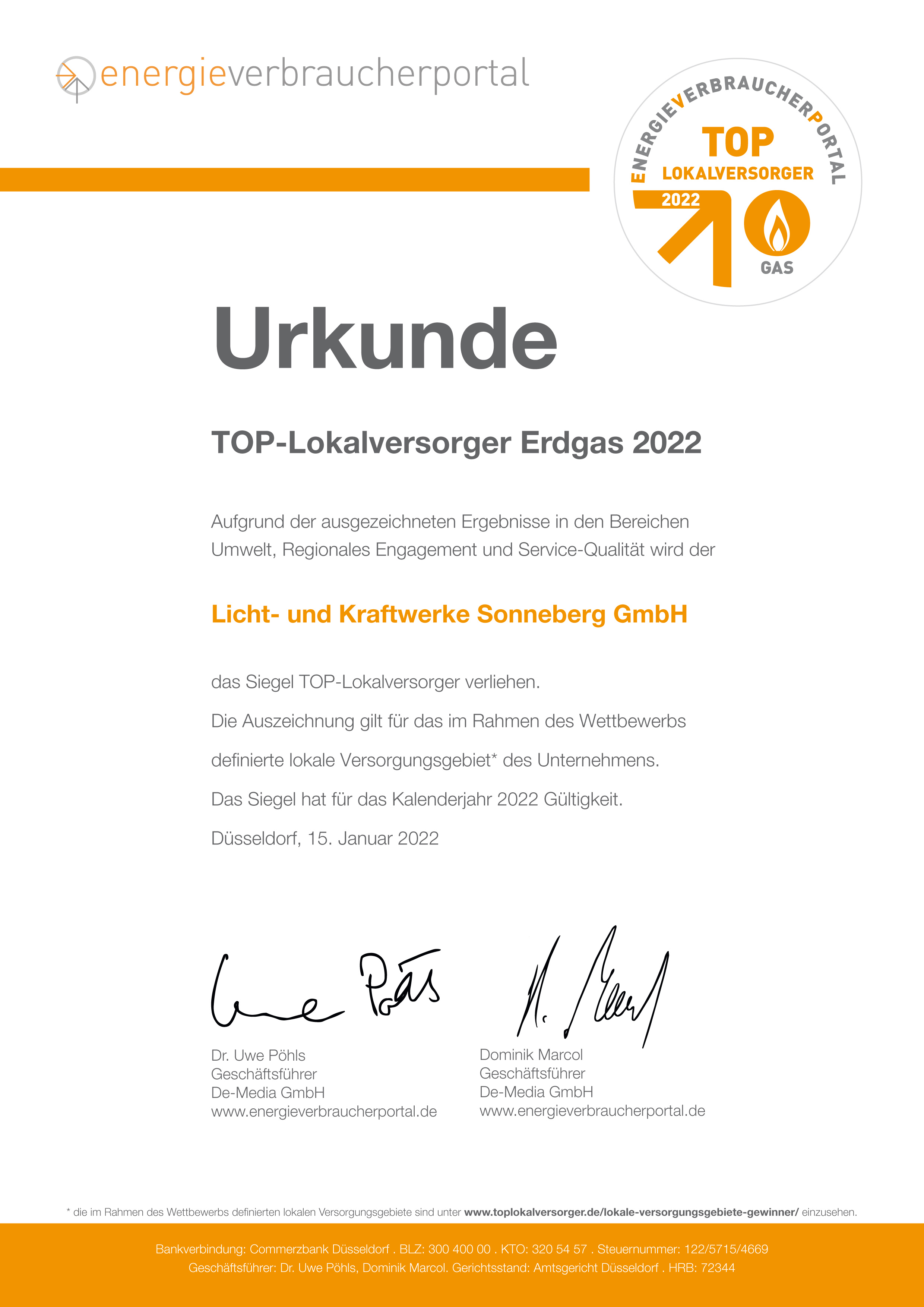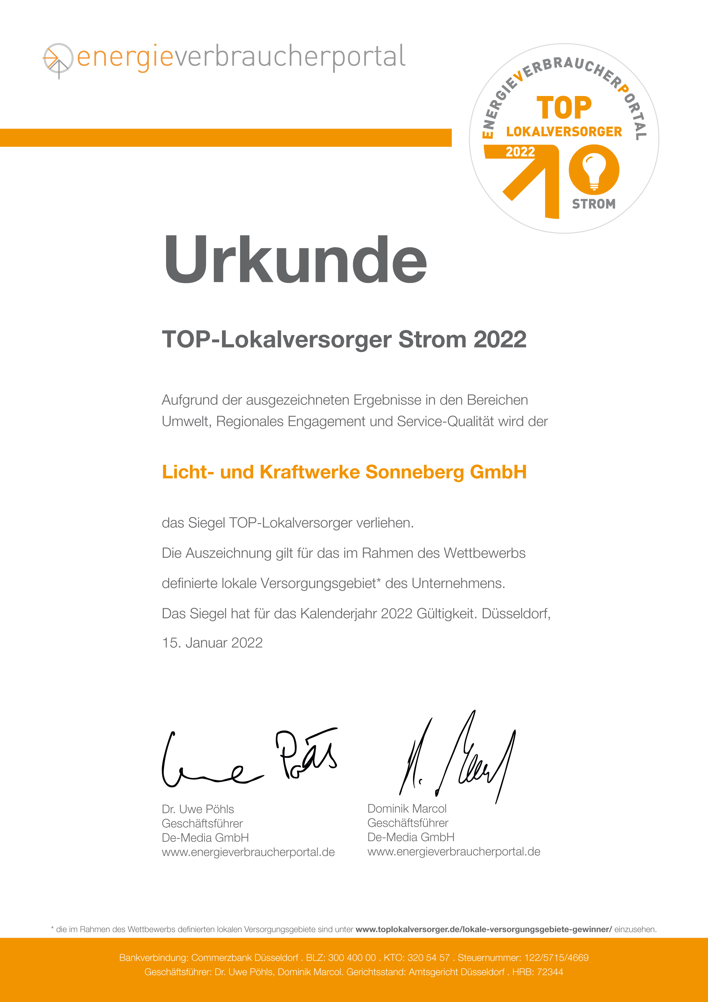 - Die Auszeichnung TOP-Lokalversorger wird für das jeweilige Kalenderjahr vergeben. Die Teilnehmer müssen eine umfangreiche Selbstauskunft vorlegen und sich einem strengen Prüfungsverfahren unterziehen. Dabei müssen fristgerecht angemeldete Versorger an einem festen Stichtag im Januar des betreffenden Kalenderjahres durch ein ausgewogenes Versorgungspaket im Vergleich zur bundesweiten Konkurrenz ausreichend punkten.
